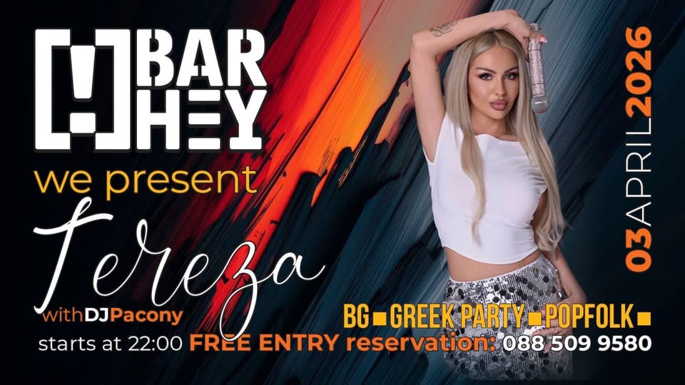 На 3 aприл прелестната Tereza заедно с DJ Pacony ще завладее Bar Hey с хитовете, които ще ви накарат да пеете, да танцувате и да се наслаждавате на момента!