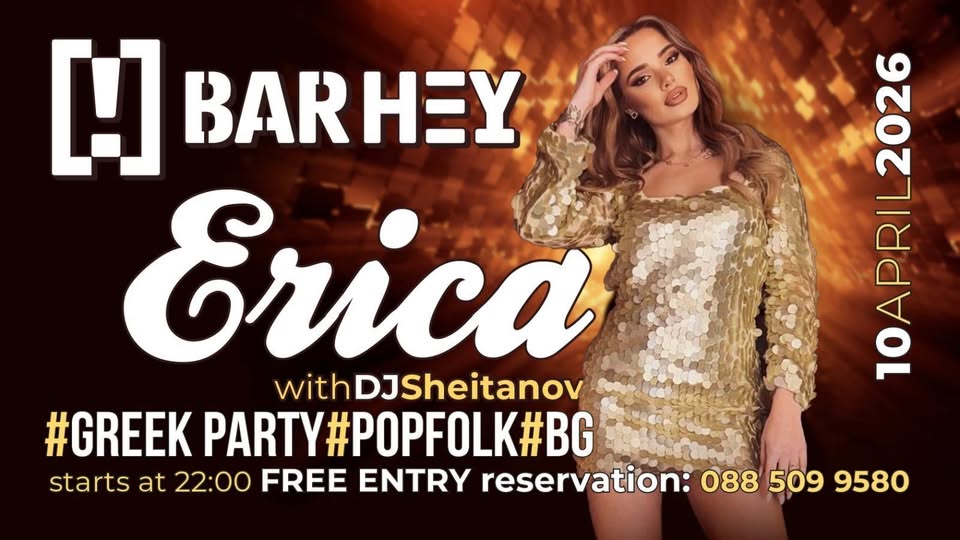 На 10 април прелестната Erica заедно с DJ Sheitanov ще завладее Bar Hey с хитовете, които ще ви накарат да пеете, да танцувате и да се наслаждавате на момента!