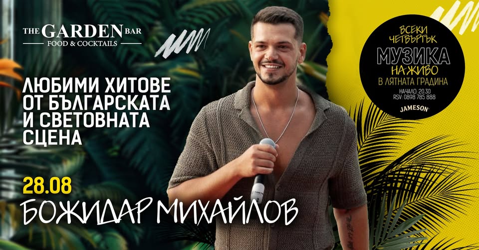 Както всеки четвъртък през лятото в уютната ни градина ви очаква музика на живо. На 28.08 ще бъдете с талантливия и чаровен БОЖИДАР МИХАЙЛОВ. Някои от вас го познават от телевизионния формат "Гласът на България 2024". Той бързо спечели сърцата на зрителите със своята харизма и прекрасен глас. На всичко отгоре е и голям симпатяга. Не пропускайте възможността да прекарате една от последните вечери на лятото приятно!