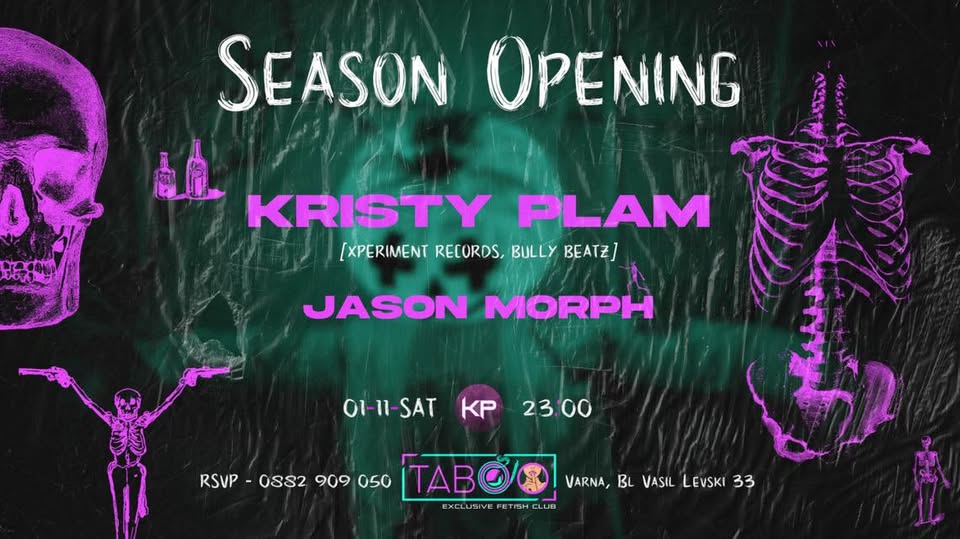 Време е за солиден старт на сезона! Очаква ви изключителна peak-time techno комбинация от Kristy Plam и местната горила Jason Morph – гаранция за експлозивна енергия и безкомпромисен звук!