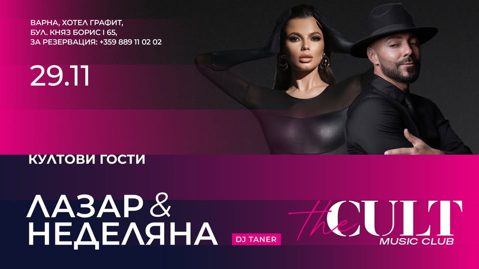 Сцената на The CULT Music Club посреща #КултовиГости: Тази събота // 29.11 // ЛАЗАР & НЕДЕЛЯНА ни вдигат с балкански ритми и любими хитове! Нова визия. Нова концепция. Същият култов дух. Варна / Хотел Графит