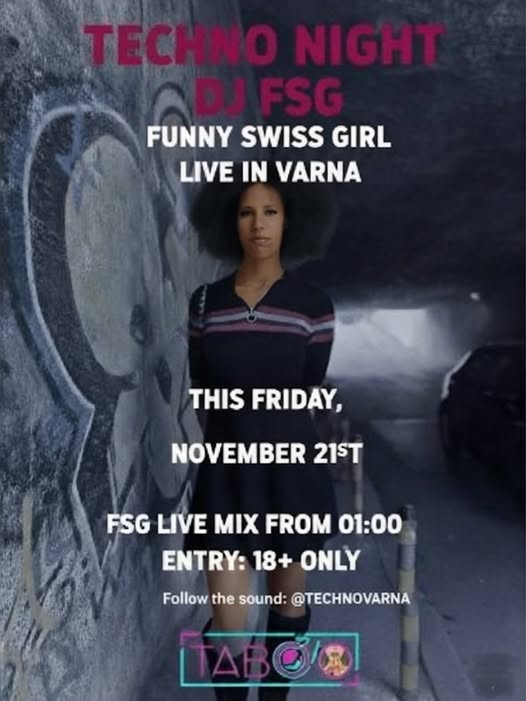 FSG поема контрола от 01:00 ч. Известна със своята заразителна енергия, тя пуска от чиста радост към музиката. Докато фокусът е върху интензивното Peak Time Техно, FSG може да ви изненада с музикални вариации от различни поджанрове на техно-то. Насладете се на артист, който идва не за хайп, а за да сподели с вас чиста, честна музикална страст. Оставете се да бъдете изненадани и изживейте една нощ с висококачествен звук и уникална атмосфера в TABOO Exclusive Fetish Club.