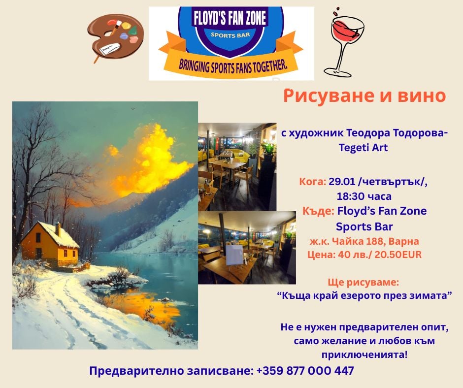 Рисуване със художничка Теодора Тодорова. Стъпка по Стъпка рисуване със Маслени бои със чаша вино. Цена= 40.00 лв или €20.50 включени всички материали.