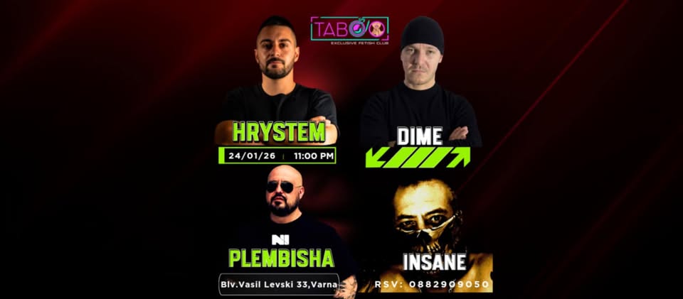 Тъмната страна на нощта. Агресивен стил, индустриално усещане и безпощадна селекция. INSANE не прави сетове – той създава преживяване. Владее тъмнината с всеки басов удар. INSANE не просто пуска музика – той разтърсва тълпата със звук, който бие директно в сърцето. Всяка мелодия е послание, всяка пауза – предизвикателство за сетивата. Потопете се в нощ, която изгаря и оставя траен отпечатък в душата ви.