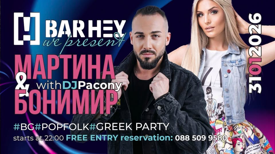 Елате на 31 януари от 22:00 часа в Bar Hey и се потопете в музикалната магия на Мартина и Бонимир, с участието на DJ Pacony!