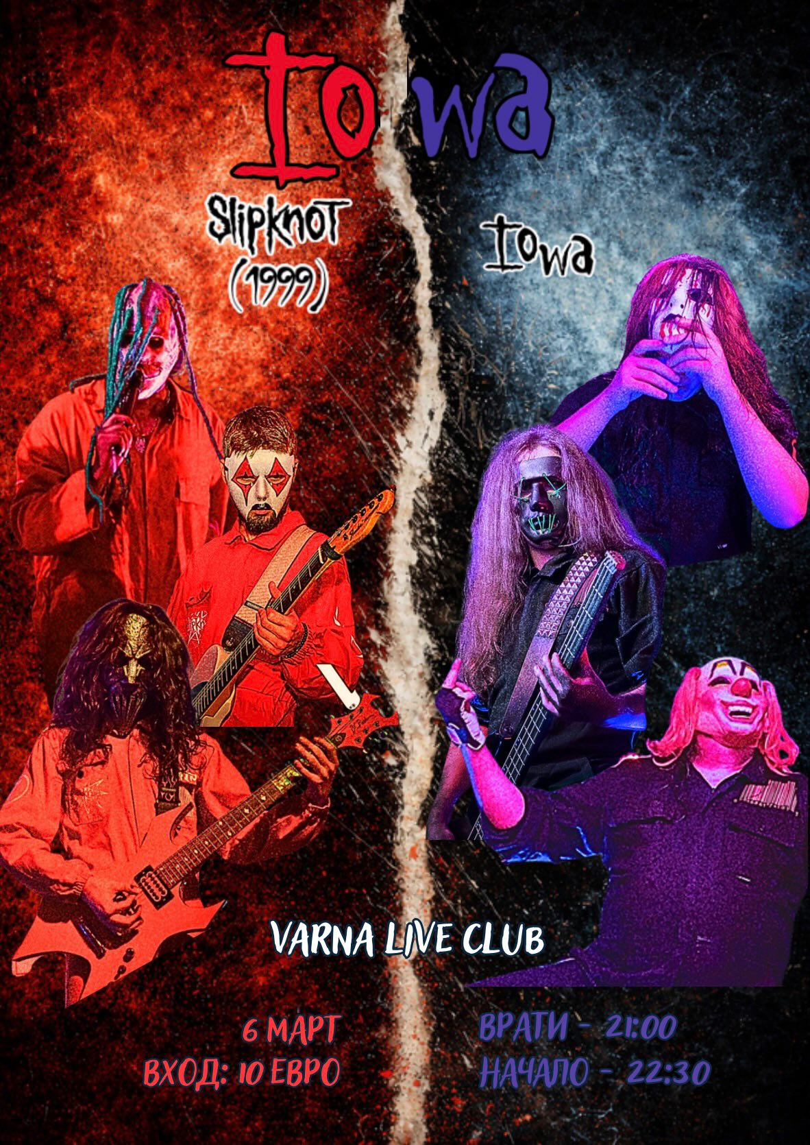 Здравейте приятели, като за първи път тази година група "Iowa" ще разтърси сцената на Varna Live Club. Този път обаче няма е просто обикновен трибют на Slipknot. През първата половина от концерта ще прозвучат "хитачките" на групата. От "Custer" и "Unsainted" до "Phychosocial" и "The Devil in I". През втората половина ще бъдат изпълнявани песни само от емблематичните първи два албума на Slipknot, a именно "Self-titled" и "Iowa". Очакваме ви, за да ви изкъртим главите както го правим вече 4 години.