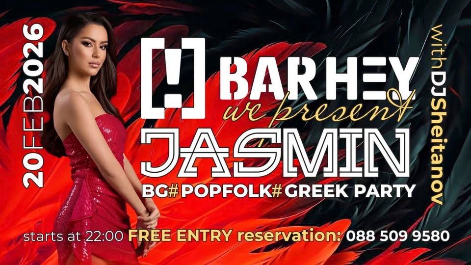 На 20 февруари прелестната Jasmin заедно с DJ Sheitanov ще завладее Bar Hey с хитовете, които ще ви накарат да пеете, да танцувате и да се наслаждавате на момента!