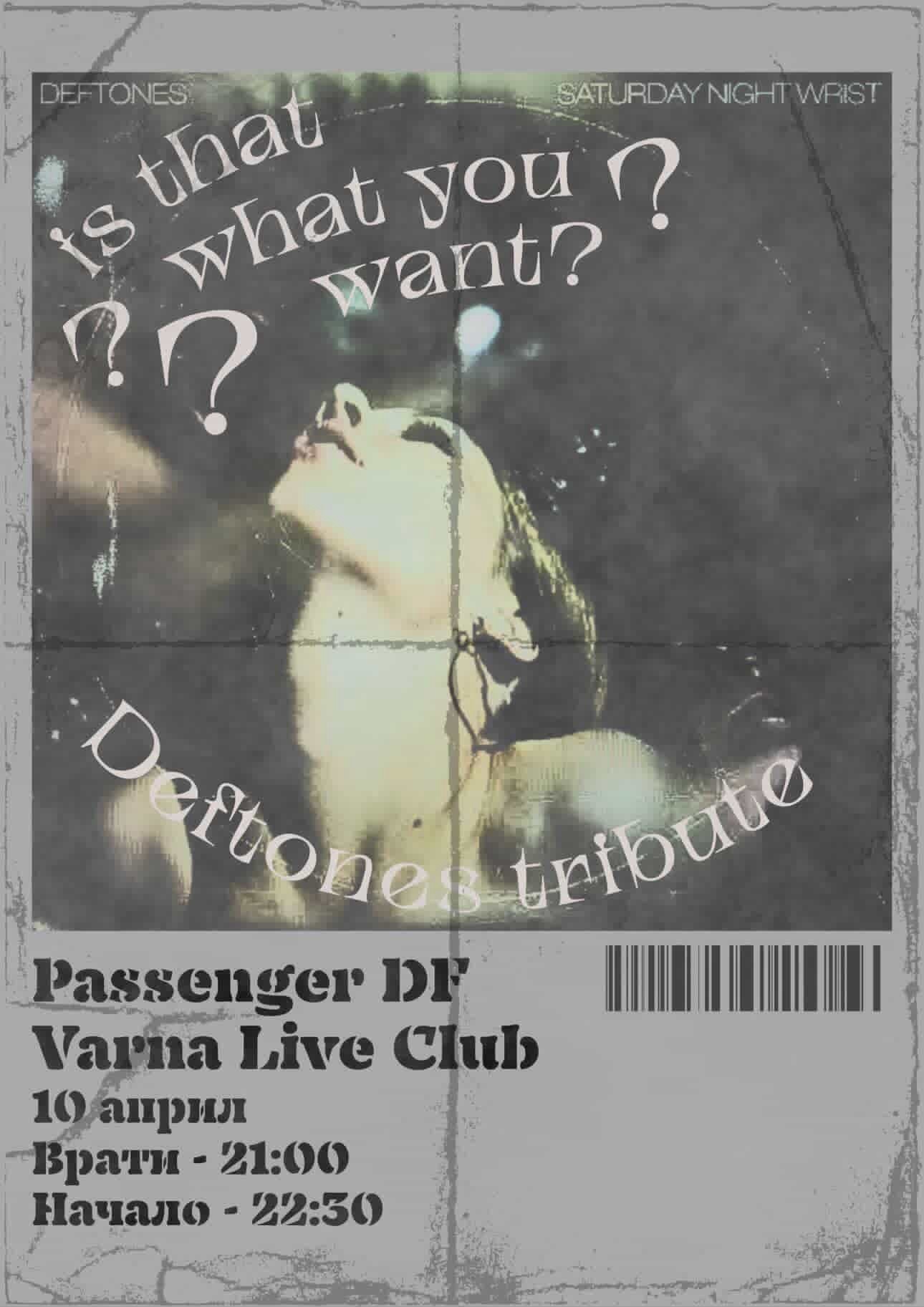 Passenger представят една вечер, посветена на музиката, атмосферата и енергията на Deftones. Пригответе се за дълбоки рифове, експлозивни вокали и онзи хипнотичен контраст между агресия и мелодия, който направи Deftones легенди. Потопете се в свят, където звукът говори повече от думите.