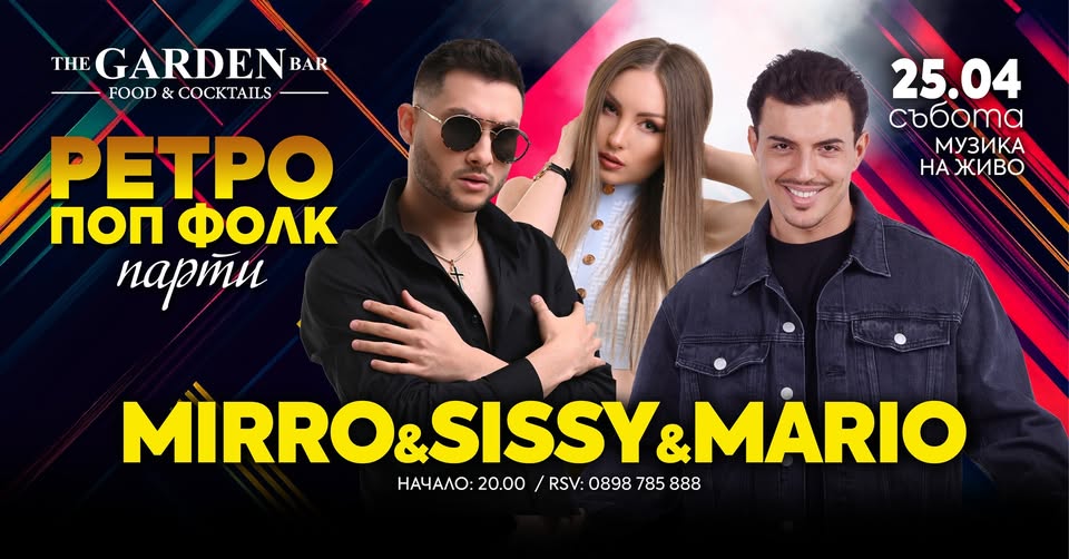 с МУЗИКА НА ЖИВО със симпатягите от бенда на МИРО, СИСИ и МАРИО. Очакват ви любими хитове от зората на този стил музика /и не само/ - песни, които завинаги остават в сърцата и които те карат да пееш и танцуваш... дори и да не можеш.