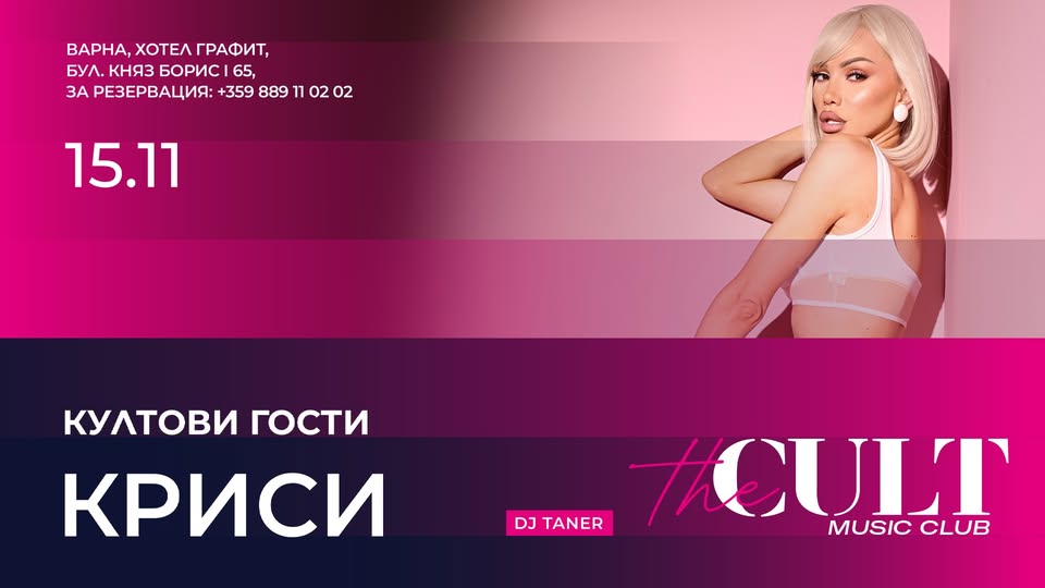 Всички съботни планове да бъдат отменени! Тя е тук и гарантира безсънна нощ. На сцената на #TheCultMusicClub се качва #Криси! Нова визия. Нова концепция. Същият култов дух. Очакваме ви! Варна / Хотел Графит
