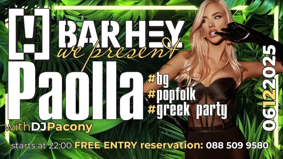 На 6 декември /Никулден/ прелестната Paolla заедно с DJ Pacony ще завладее Bar Hey с хитовете, които ще ви накарат да пеете, да танцувате и да се наслаждавате на момента!